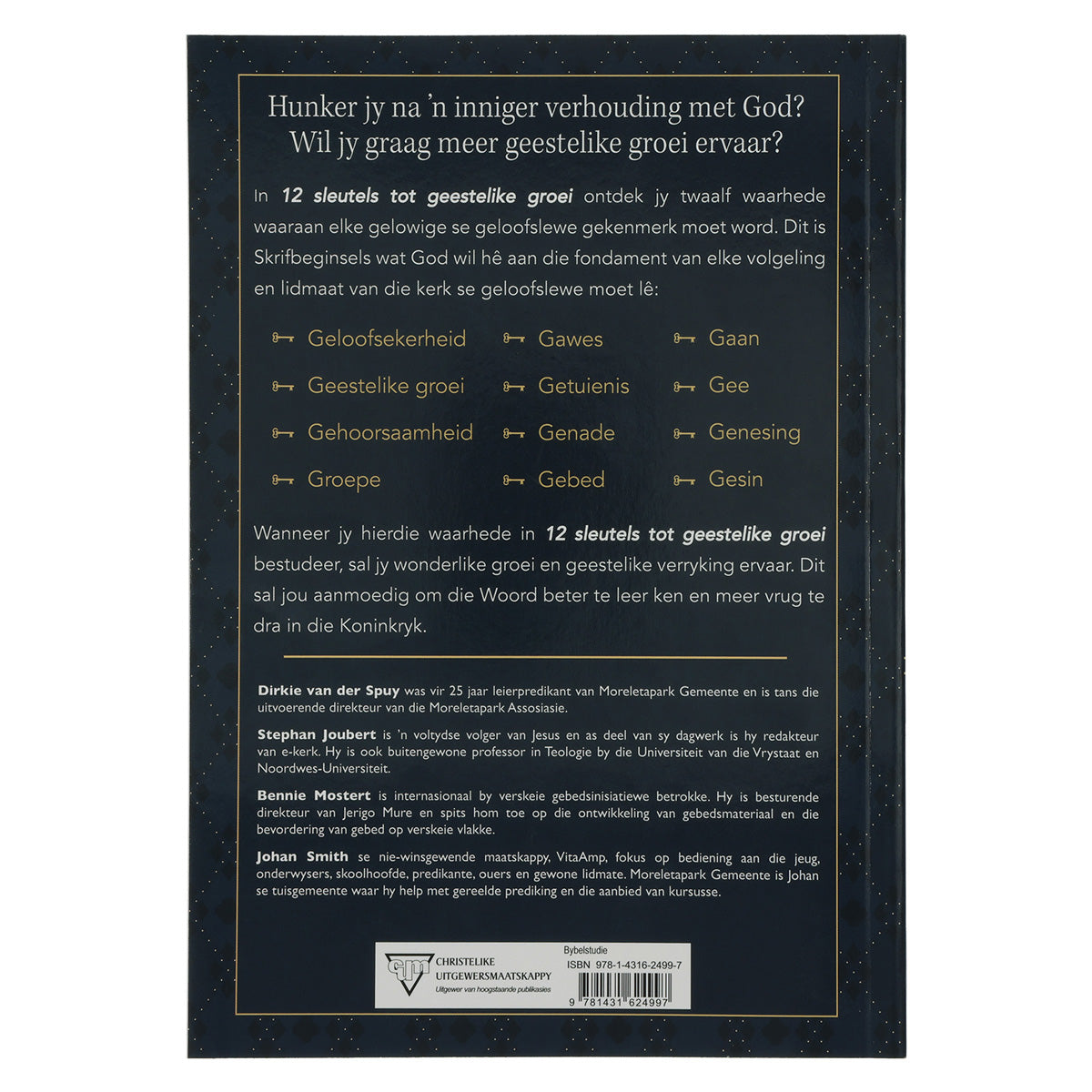 Baie gelowiges hunker na ’n inniger verhouding met God en wil graag geestelik meer groei. In 12 Sleutels tot geestelike groei span vier bekende outeurs saam om vir gelowiges 12 Skrifbeginsels te gee wat ons geloofslewe moet kenmerk. Dit is Skrifbeginsels wat God wil hê aan die fondament van elke volgeling van Christus se geloofslewe moet lê: