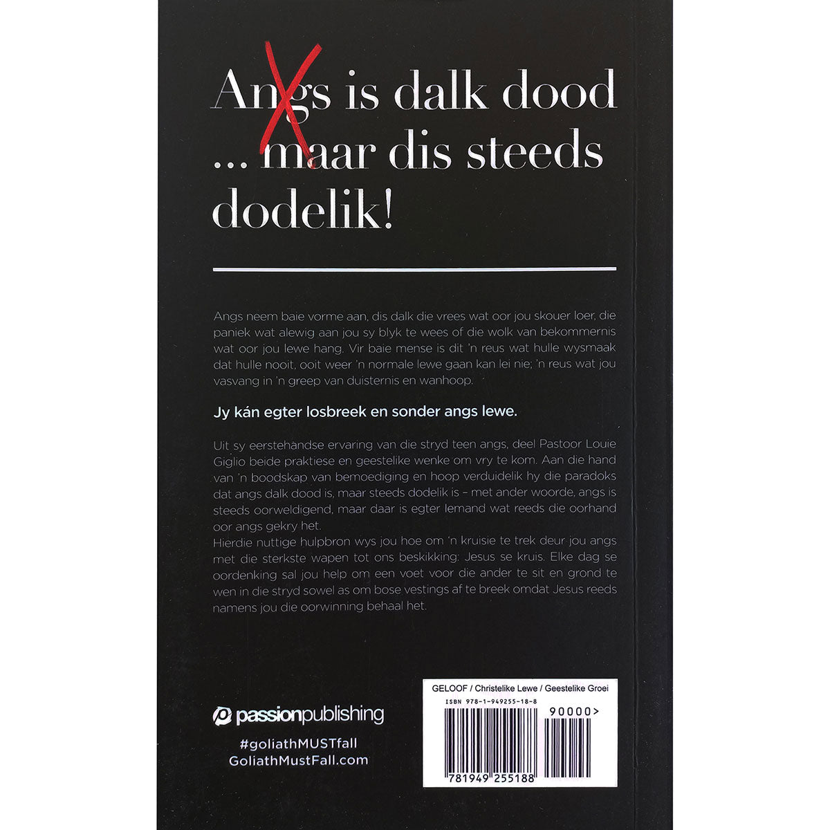 Uit sy eerstehandse ervaring van die stryd teen angs, deel Pastoor Louie Giglio beide praktiese en geestelike wenke om vry te kom. Aan die hand van ’n boodskap van bemoediging en hoop verduidelik hy die paradoks dat angs dalk dood is, maar steeds dodelik is – met ander woorde, angs is steeds oorweldigend, maar daar is egter Iemand wat reeds die oorhand oor angs gekry het.