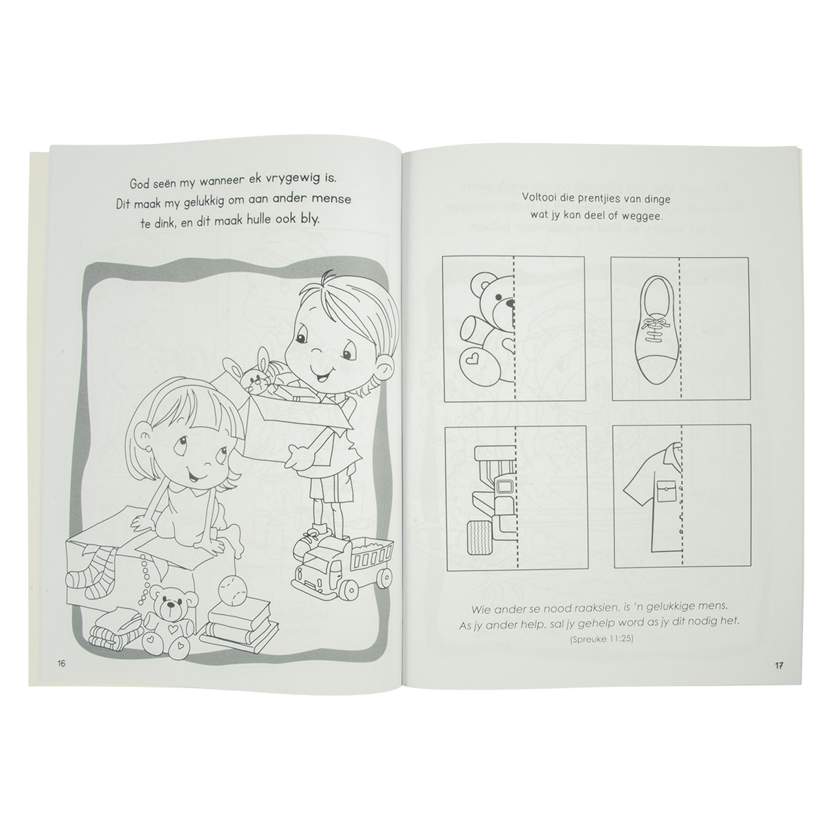 Veertien kerngedagtes uit Spreuke word gekombineer met opvoedkundige speletjies vir seuns en meisies. Aktiwiteite soos soek die pad, kleur die prentjie in en soek die verskille moedig kreatiwiteit aan, verbeter fyn motoriese vaardighede, ontwikkel probleemoplossingsvaardighede en verbeter konsentrasie.