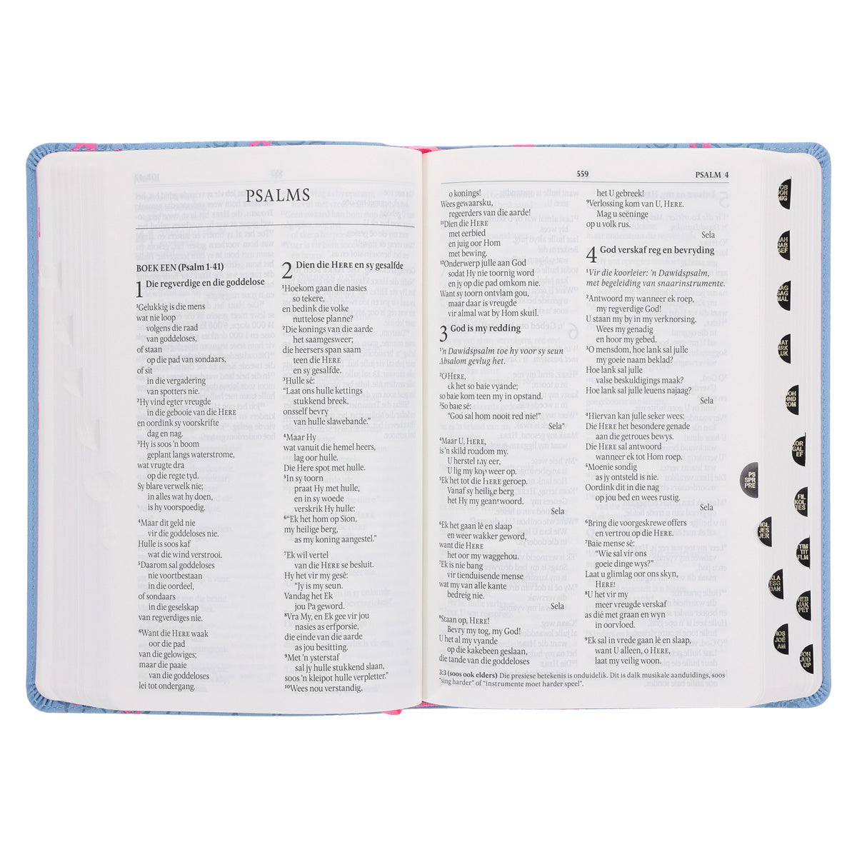 NLV Ligblou Met Pienk Blomme Kunsleer Standaard Bybel Met Duimgrepe