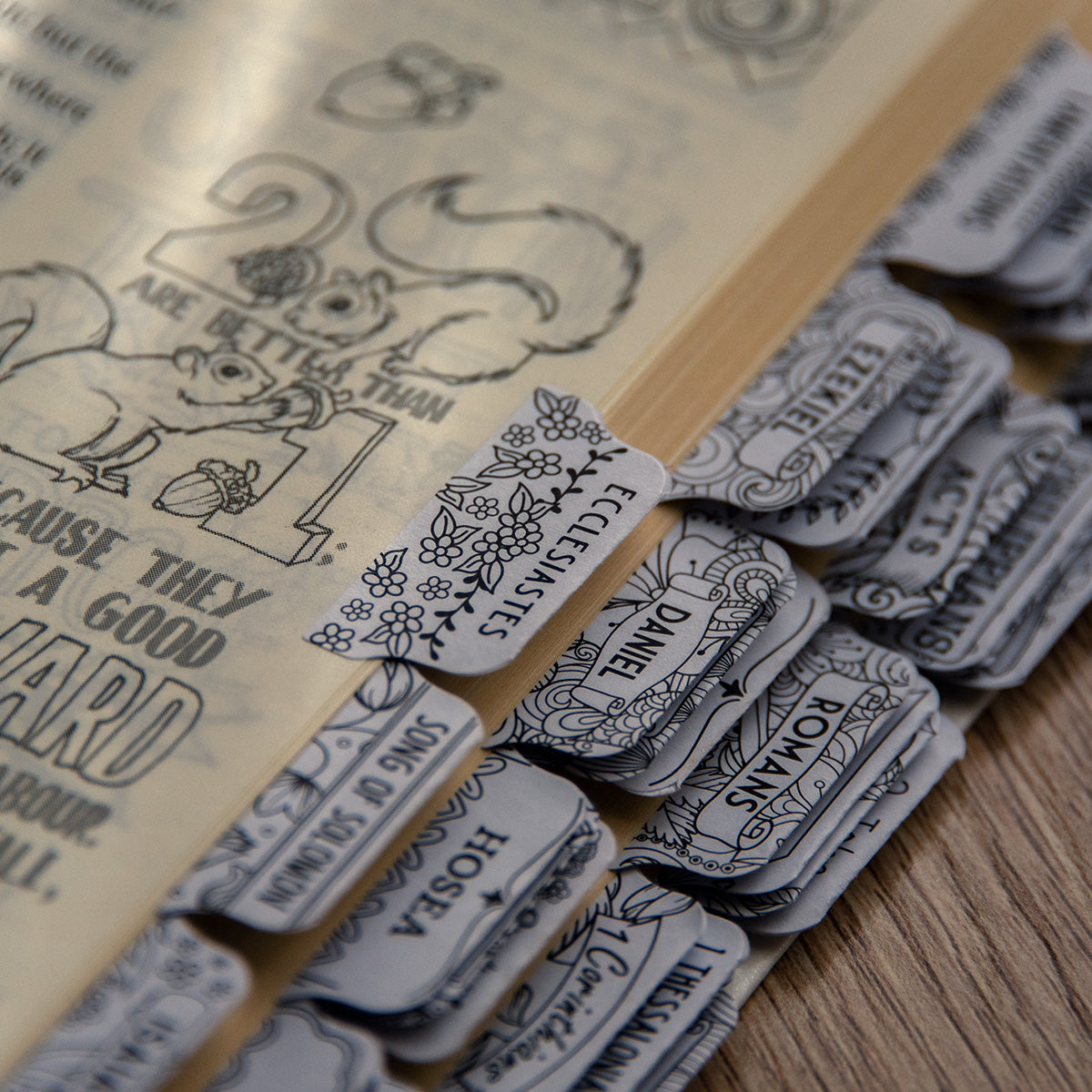 The line-art drawings on each tab accentuate your Bible pages while making it easy to flip to the desired book. Use colored pencils or gel pens to add vibrant colors to each Bible tab.