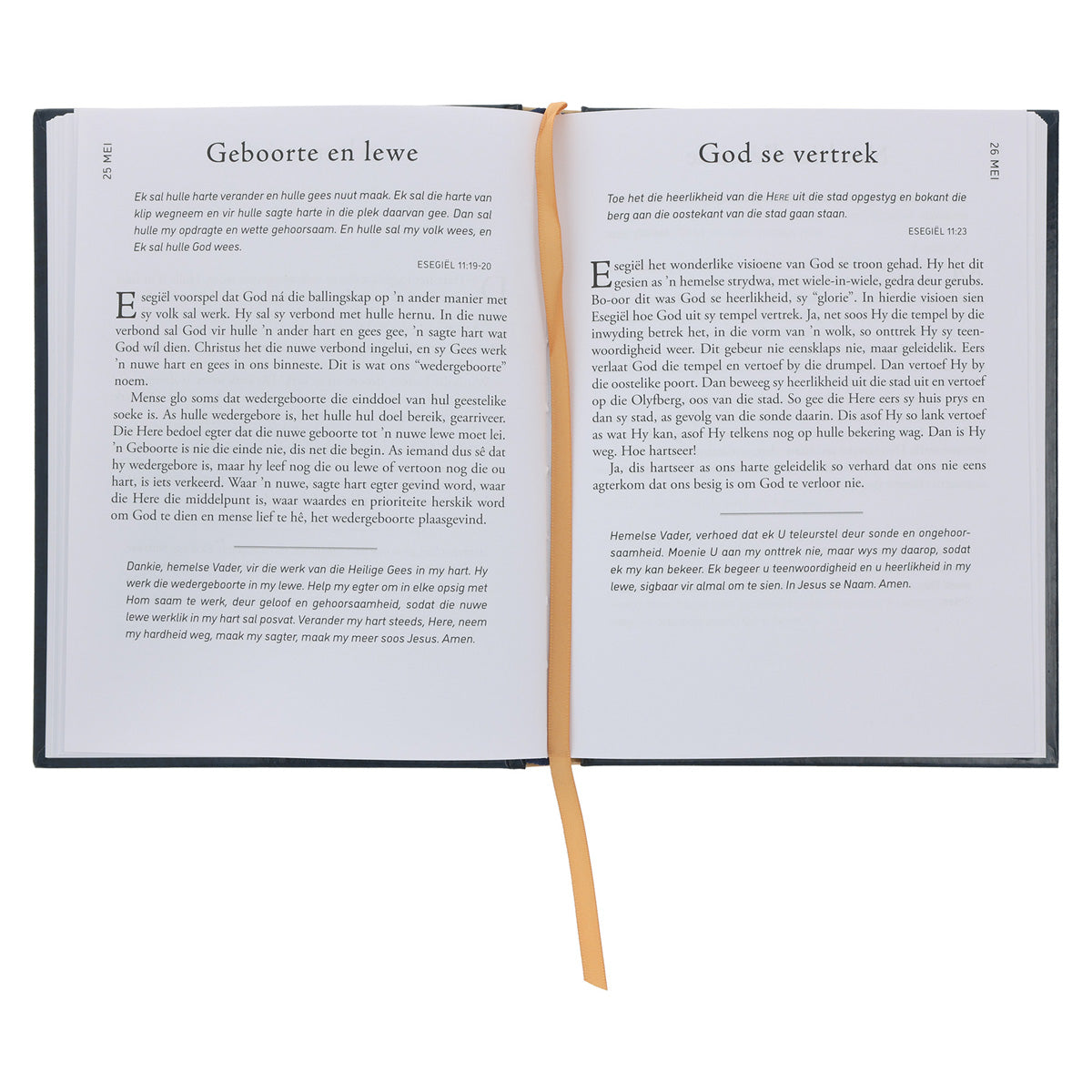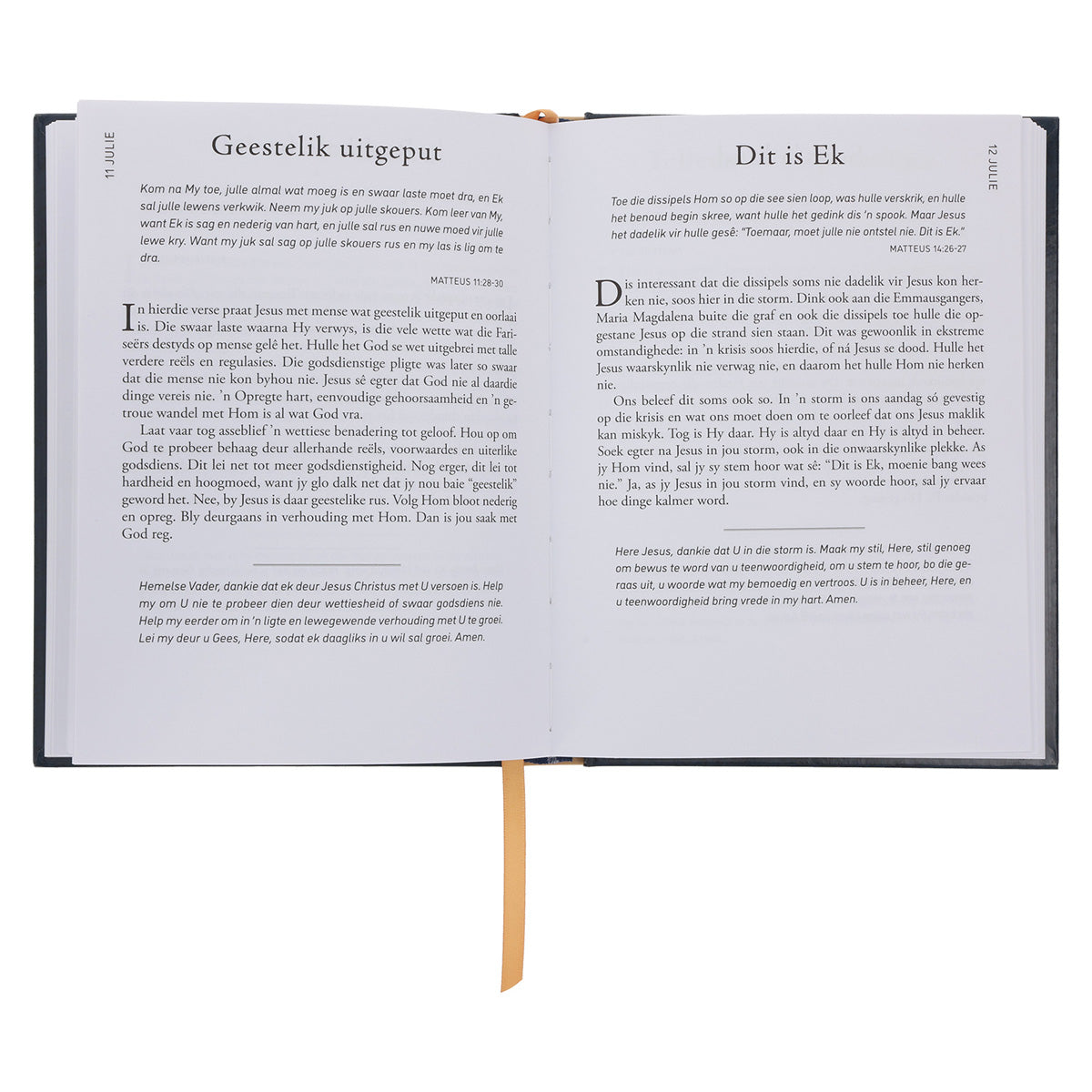 - Elke dag bevat ’n vers of gedeelte uit die Skrif, ’n kort oordenking en gebed.