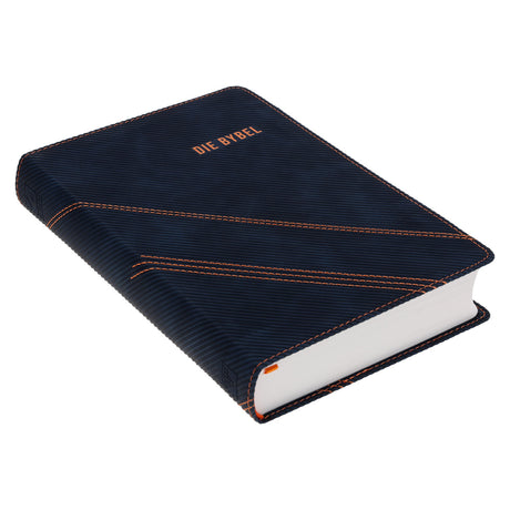 NLV Donkerblou en Oranje Kunsleer Standaard Bybel Met Duimgrepe