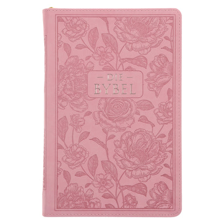 NLV Pienk Blomme Kunsleer Standaard Bybel Met Ritssluiter en Duimgrepe