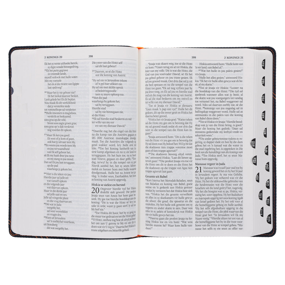 NLV Donkerblou en Oranje Kunsleer Standaard Bybel Met Duimgrepe is backordered and will ship as soon as it is back in stock.