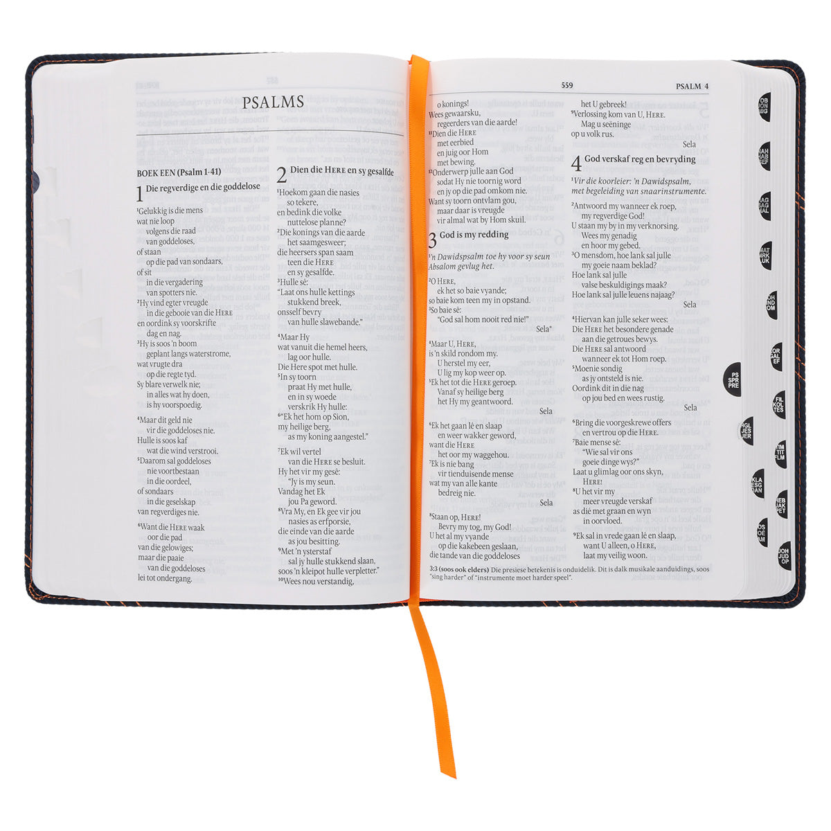 NLV Donkerblou en Oranje Kunsleer Standaard Bybel Met Duimgrepe