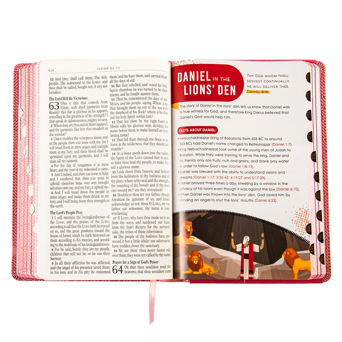 The Kids Bible is a full-text King James Version Bible specially designed for readers ages 8-12, to encourage them to begin the adventure of lifelong Bible reading. The 40 full-color pages interspersed throughout the Old and New Testaments of the Bible offer study helps to expand young readers’ Bible knowledge and guide them to connect to the biblical people, places, and events they are reading about.