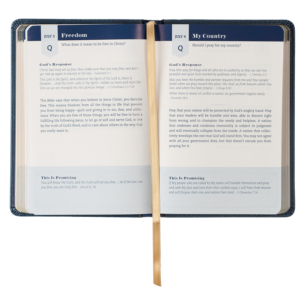 The devotional book's compact size makes it easy to slip into a backpack for devotions on the go, and a presentation page lets you personalize it. A navy satin ribbon marker is included to keep your place. The one-color pages are gilt-edged and match the gold foil accents in the cover perfectly.