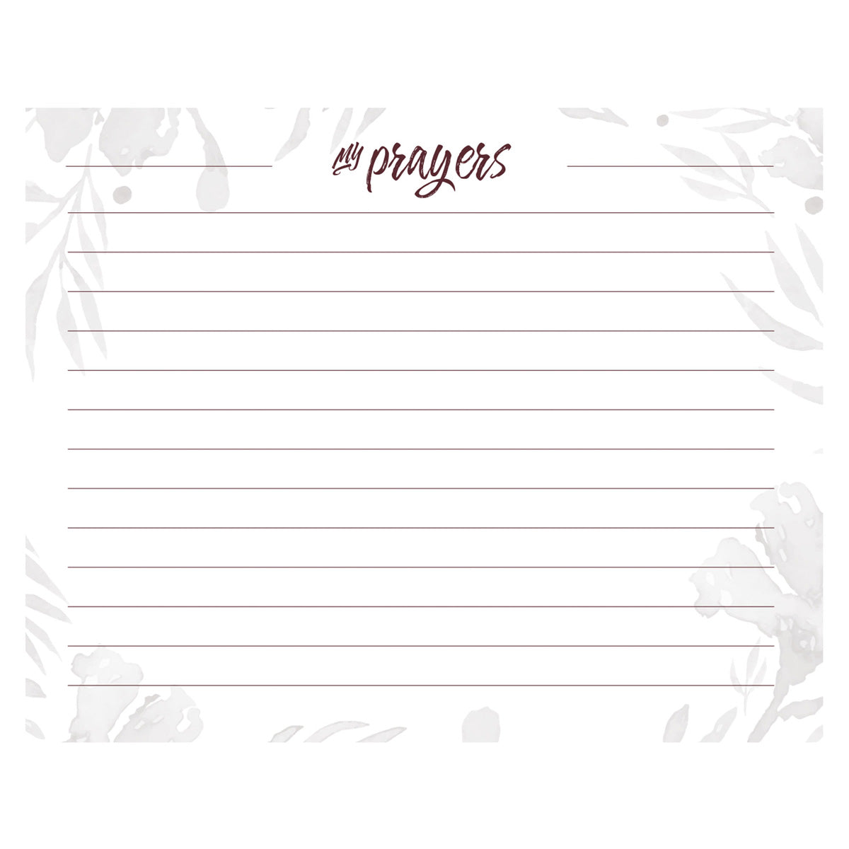 “My Prayer” durable matte tin is printed with watercolor floral patterns on its white body as well as on its white lid. It has a gold interior and gold edging around the lid and base. A gold file label holding a removable tab beautifully printed with “My Prayers” in a scripted font on the front of the tin. The cards within include a theme titled prayer on one side and a lined space to write your prayers or answered prayers on the other side.