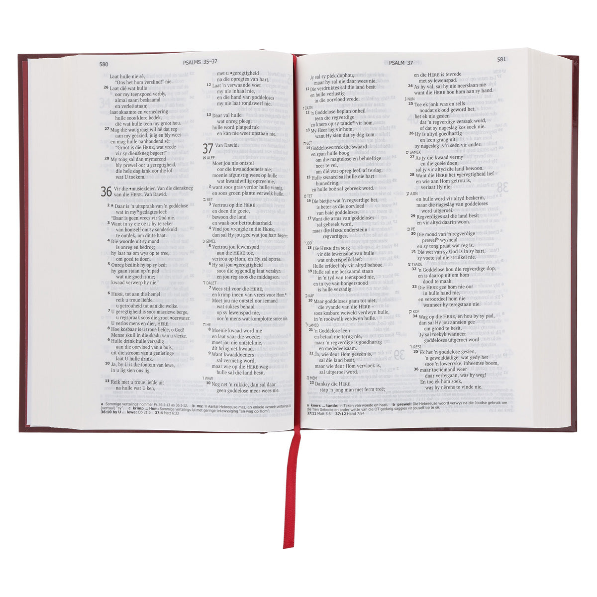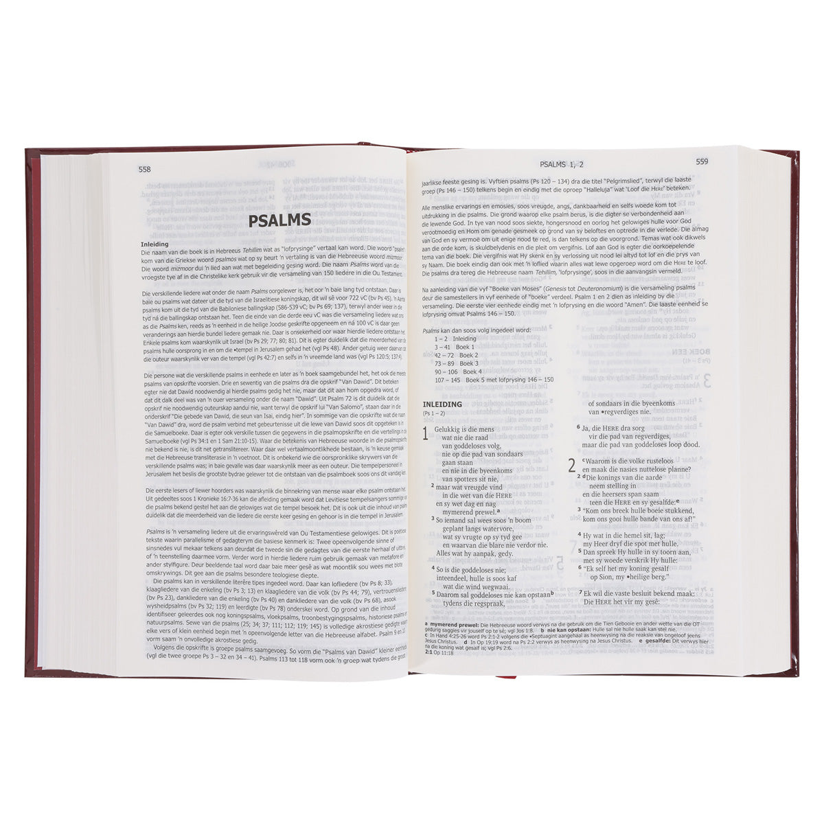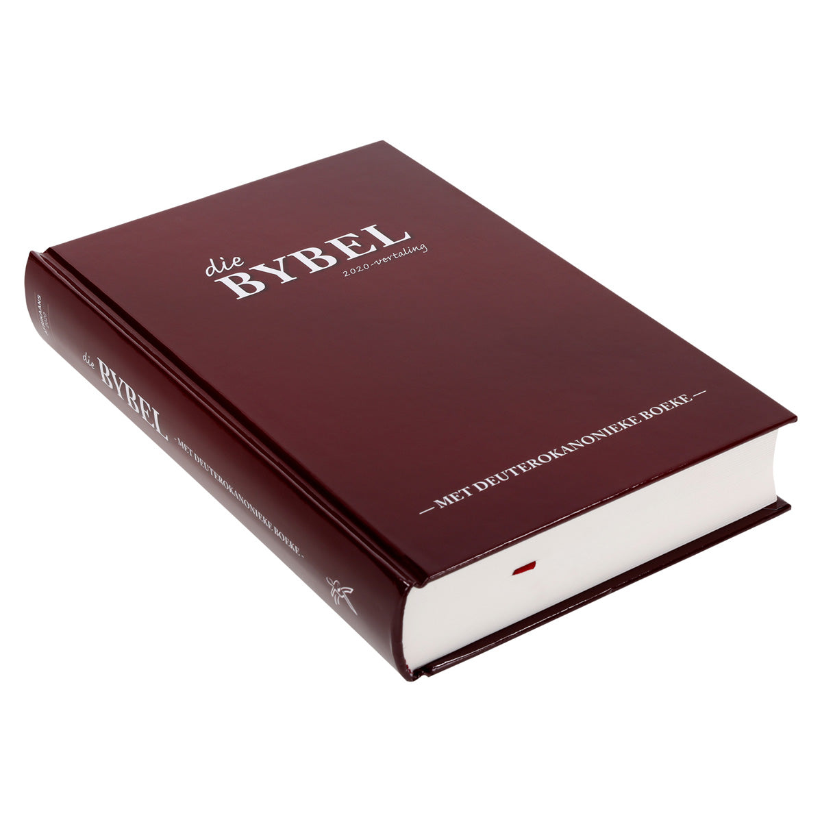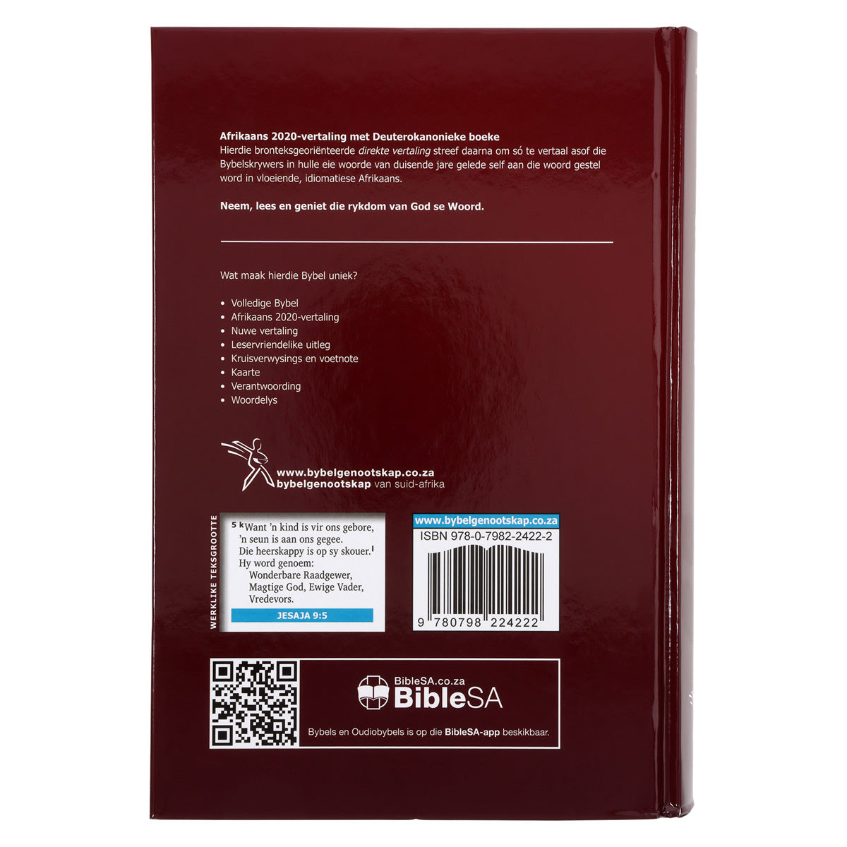 Afrikaanse 2020-vertaling, volledige Bybel met Deuterokanonieke boeke, medium grootte met volkleur hardeband, kruisverwysings, voetnote, woordelys en kaarte.