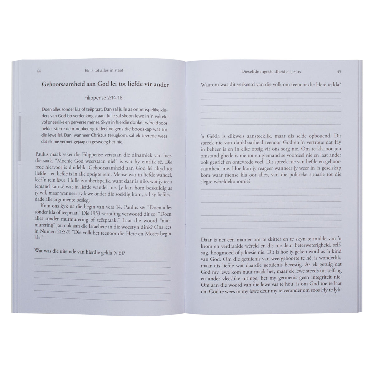 Groot gedeeltes Bybelteks uit die NLV in Ek is tot alles in staat sorg vir maklike naslaan.