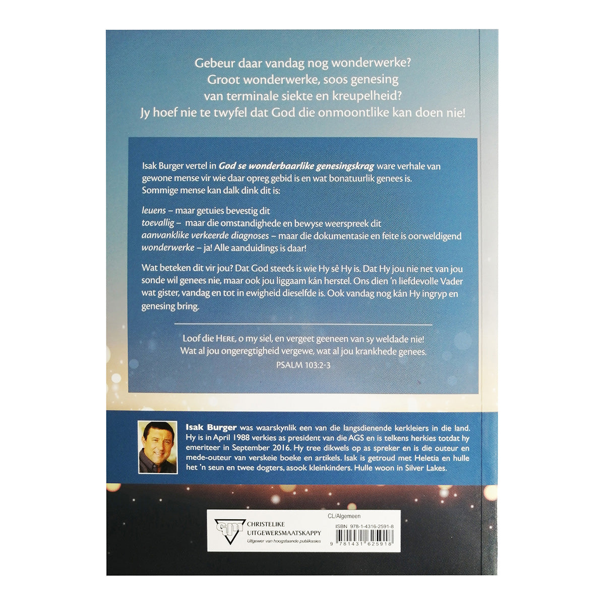 Isak Burger vertel in God se wonderbaarlike genesingskrag 11 verstommende ware verhale van gewone mense vir wie daar opreg gebid is en wat bonatuurlik genees is. Saam met die ware verhale van mense wat persoonlik wonderbaarlike wonderwerke beleef het, praat Isak oor die aard van wonderwerke, wonderwerke in die Bybel en die mite dat God en die wetenskap altyd teenoor mekaar gestel moet word.