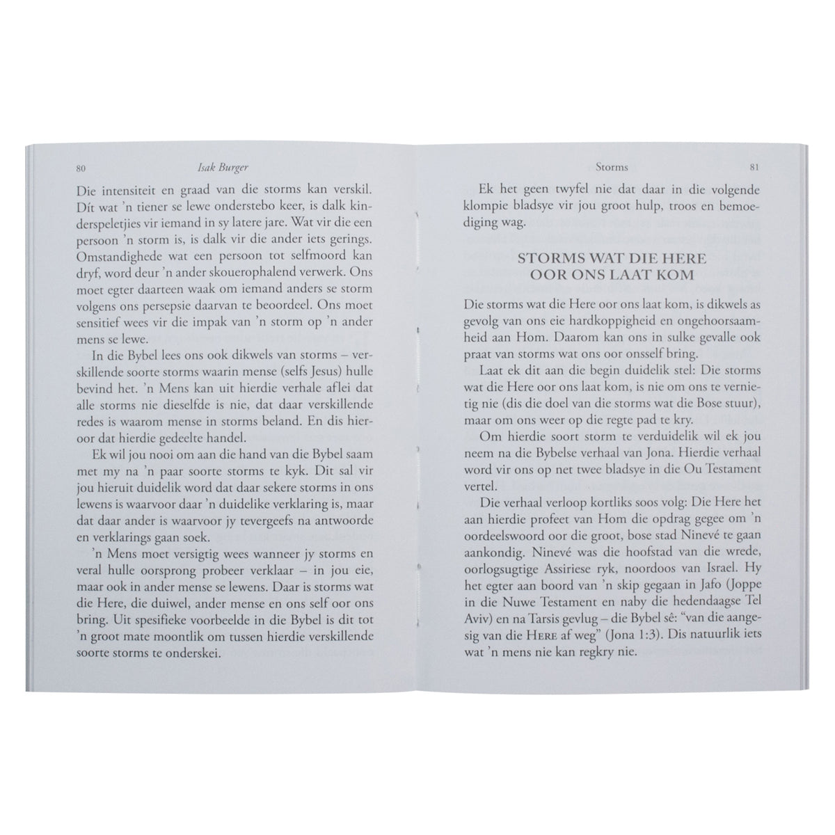 • In “Storms” verduidelik Isak dat niemand onbepaald die storms van die lewe kan vryspring nie en dat ’n mens sensitief moet wees vir die impak van ’n storm op ander mense se lewens.