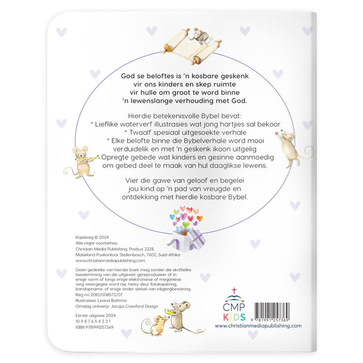 - God se kernbeloftes, mooi verduidelik binne die Bybelverhale en beklemtoon met 'n geskenk ikoon om dit verstaanbaar vir kinders te maak.
