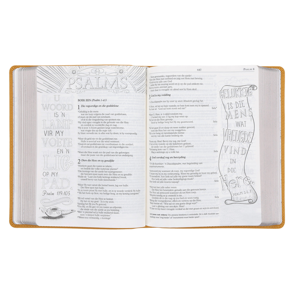 My kreatiewe Joernaal-Bybel bevat die volledige teks van die Nuwe Lewende Vertaling en ongeveer 400 woordkuns-teksverse om in te kleur. Elke bladsy het breë kantlyne met óf ’n woordkuns-teksvers, óf lyntjies waar gebede, notas en ander persoonlike inskrywings gedoen kan word.