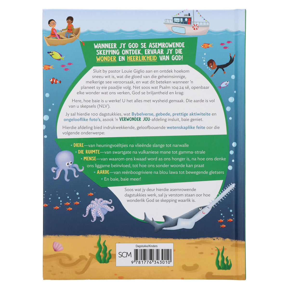 Die volkleur boek is vol prettige kleurillustrasies en foto’s wat die skoonheid vasvang van die wêreld waarin ons leef. Dit beloof om kinders se begrip van die heelal uit te brei, en hul geloof in ons Skepper-God te versterk. Elke dagstukkie bevat ’n wetenskaplike gedeelte met interessante feite en eksperimente wat die kinders self of saam met hul ouers kan doen, 'n "Verwonder jou" gedeelte, asook ’n gepaste Bybelvers en gebed.