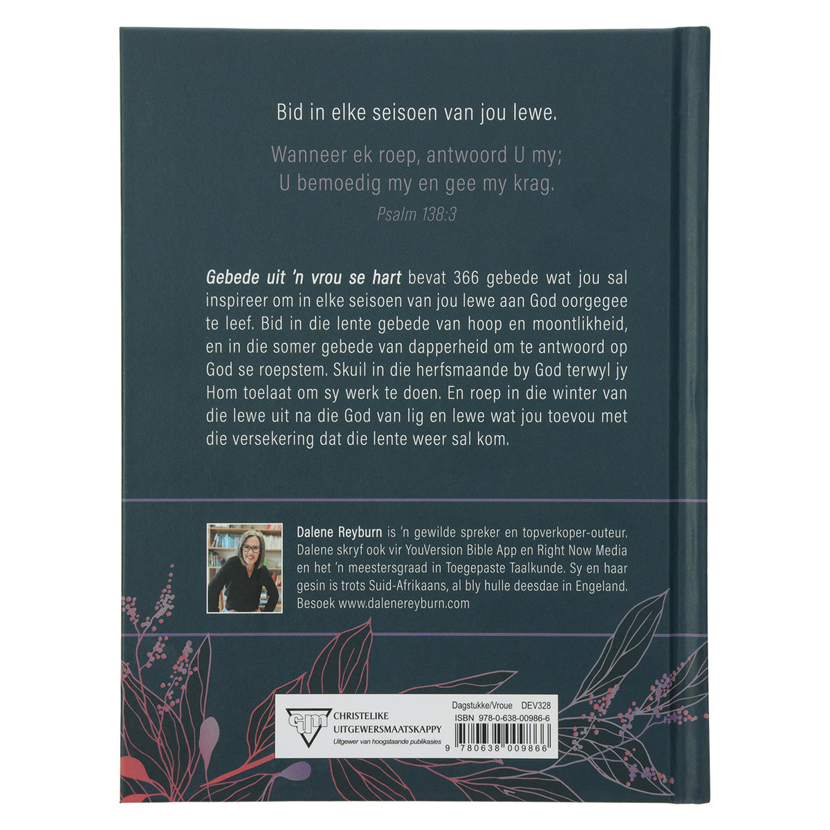 Gebede uit ’n vrou se hart bevat 366 gebede wat elke vrou sal inspireer om in elke seisoen van haar lewe aan God oorgegee te leef. Word geïnspireer om in die lente gebede van hoop en moontlikheid te bid, en in die somer gebede van dapperheid om te antwoord op God se roepstem. Skuil in die herfsmaande by God terwyl jy Hom toelaat om sy werk te doen. En roep in die winter van die lewe uit na die God van lig en lewe wat jou toevou met die versekering dat die lente weer sal kom.