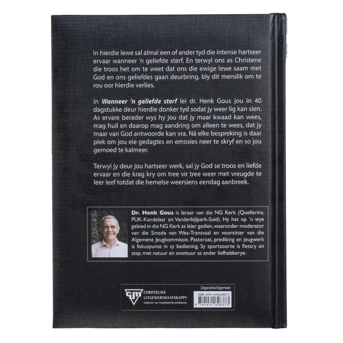 Die dood van ’n geliefde bring intense hartseer mee. Dr. Henk Gous deel in Wanneer ’n geliefde sterf uit sy jare lange ervaring as berader asook sy persoonlike ervaring met die verlies van sy dogter. Hy is daarom ideaal toegerus om jou met wysheid en empatie op hierdie moeilike pad van rousmart te begelei. Elkeen van die 40 dagstukkies het plek om jou eie emosies, vrae aan God, ondraaglike pyn, selfs woede, en enige ander gedagtes neer te skryf. So sal hierdie boekie ’n joernaal wees van jou uniek persoonlike reis na aanvaarding, vertroosting, vrede en vreugde.