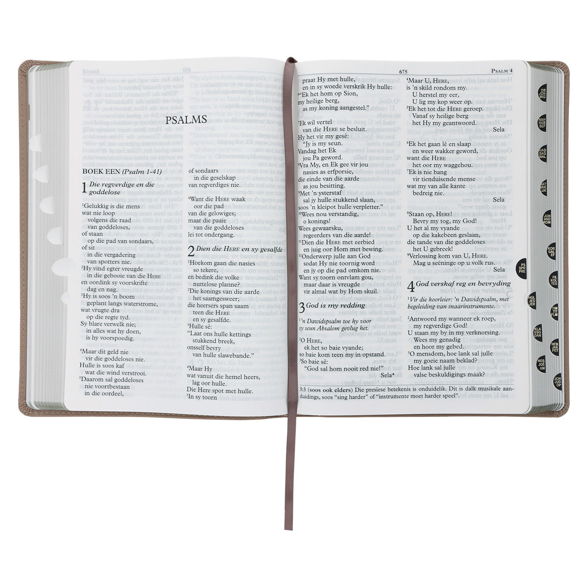 Hierdie grootdruk-uitgawe met egte leer-omslag beskik oor die volgende kenmerke: