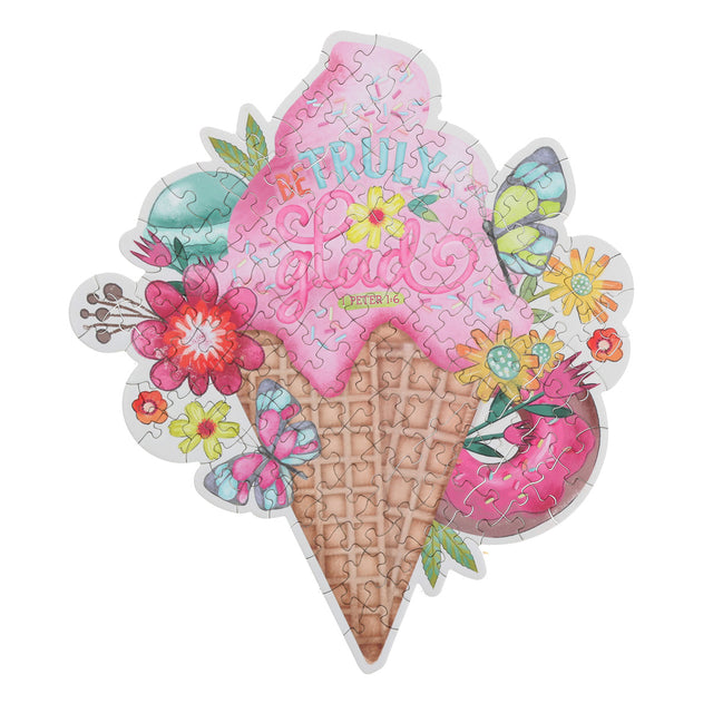 Delight in this ice cream cone-shaped puzzle designed to bring joy and encouragement! Surrounded by butterflies, flowers, and sweet treats, it features the uplifting verse “Be Truly Glad” – 1 Peter 1:6. A colorful and creative way to explore faith, this charming puzzle encourages young girls to embrace joy and God’s goodness in every piece.