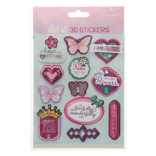 Delight and inspire with this Twelve-Piece 3D Sticker Set, designed for young girls! Featuring butterflies, tiaras, and uplifting scriptures, each sticker sparkles with glitter, silver foil, and dazzling rhinestones. These vibrant, faith-filled designs are perfect for decorating notebooks, crafts, or gifts—encouraging confidence and joy with every shimmering detail. A beautiful way to share faith and fun!