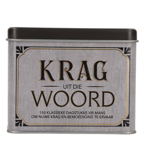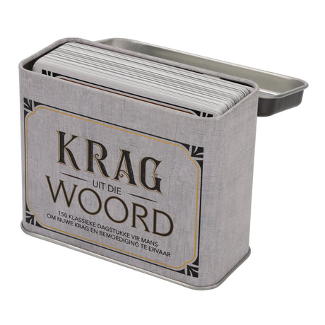 In stockSale price R29.00 Regular price R49.00Unit price /Unavailable Krag vir ’n Vrou Se Hart Afrikaans Cards In Tin - 150 Dagstukke vir Vroue