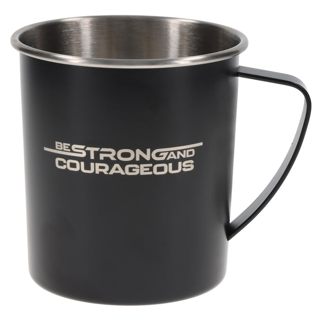 The Be Strong and Courageous Black Stainless Steel Camp Style Mug makes a great addition for those who like to explore the great outdoors.