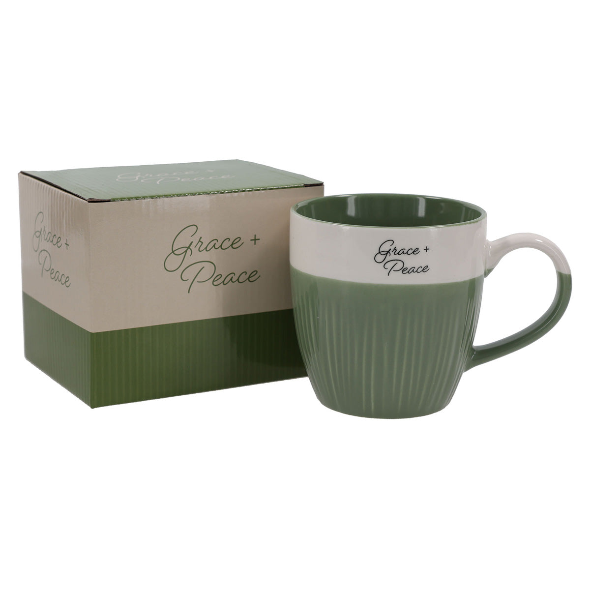 Start your day with calm and comfort using the Grace and Peace Green Ceramic Mug. Featuring a soothing two-tone design with a ribbed green base and “Grace + Peace” elegantly scripted on the top, this mug brings warmth to every sip. Perfect for tea, coffee, or quiet moments of reflection—an encouraging gift or personal favorite.