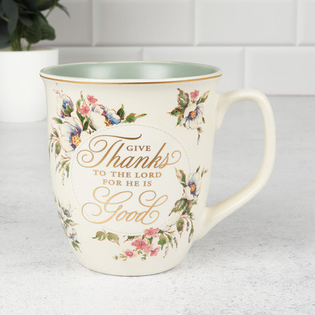 Give Thanks To The Lord Olive Interior Ceramic Mug - Psalms 107:1