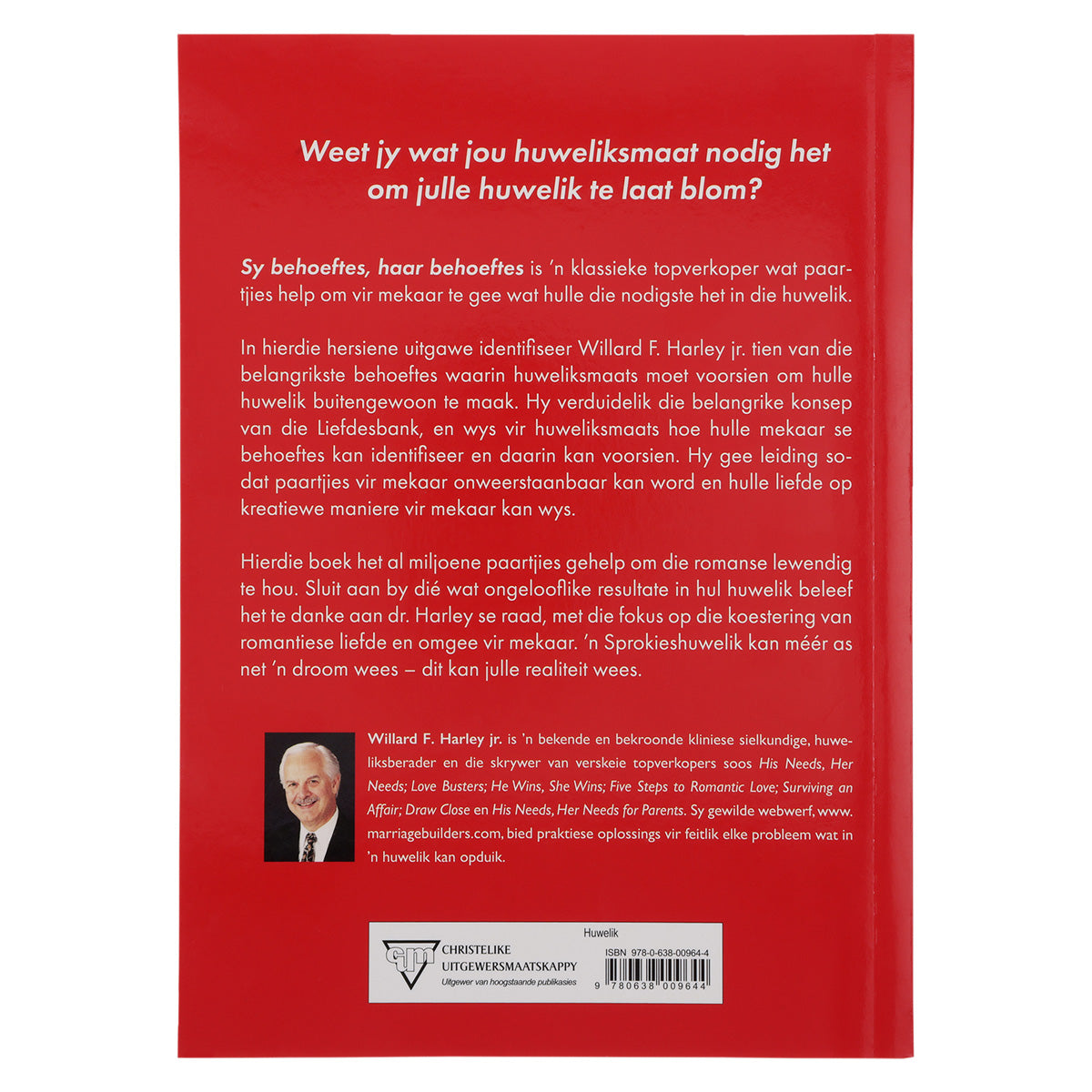 Willard F. Harley jr. identifiseer in Sy behoeftes, haar behoeftes tien behoeftes waarin huweliksmaats moet voorsien om hulle huwelik buitengewoon te maak. Hy en sy vrou, Joyce, verduidelik die belangrike konsep van die Liefdesbank en wys vir huweliksmaat hoe hulle in mekaar se behoefte aan liefdesbetuiging en seksuele bevrediging, kommunikasie en kameraadskap, eerlikheid en aantreklikheid, finansiële versorging en huishoudelike versorging, en toewyding aan die gesin en bewondering kan voldoen. Die hersiene uitgawe van hierdie klassieke boek bevat ook ekstra bylae en vraelyste om die beginsels prakties toe te pas.