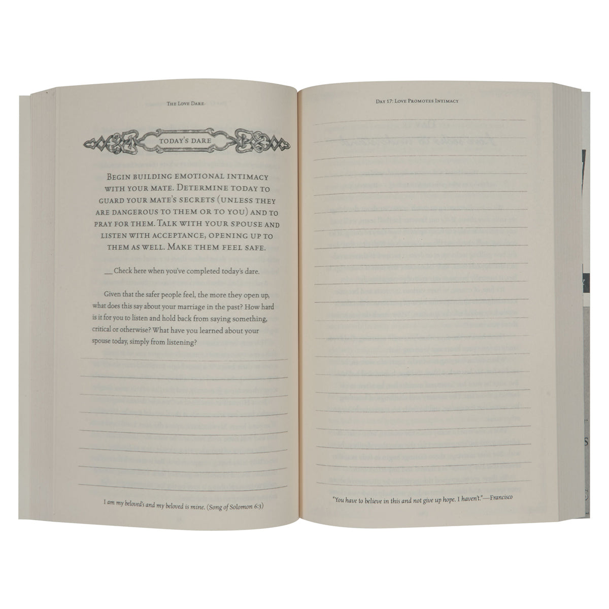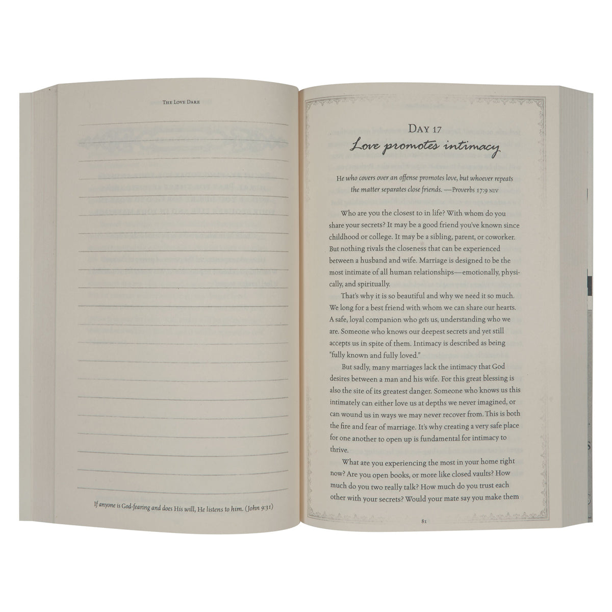 The Love Dare, the New York Times No. 1 best seller that has sold five million copies and was major plot device in the popular movie Fireproof, is a 40-day challenge for husbands and wives to understand and practice unconditional love. Whether your marriage is hanging by a thread or healthy and strong, The Love Dare is a journey you need to take. It’s time to learn the keys to finding true intimacy and developing a dynamic marriage.