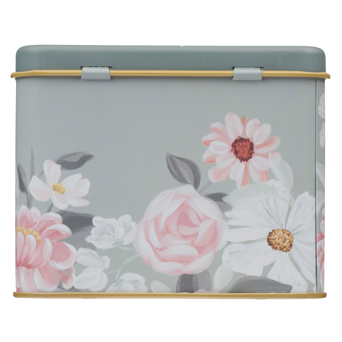 The matte metal tin features a calming light gray background, with the bottom of the tin encircled by white and pink flowers accented with yellow. The interior of the box and the edging around the lid are brass. To match, a brass label holder with a removable label stands on the front of the box.