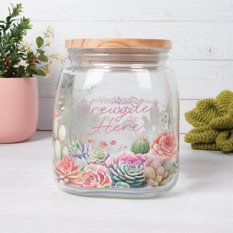 Vind Vreugde in die Here Afrikaans Glass Cookie Jar with Bamboo Lid