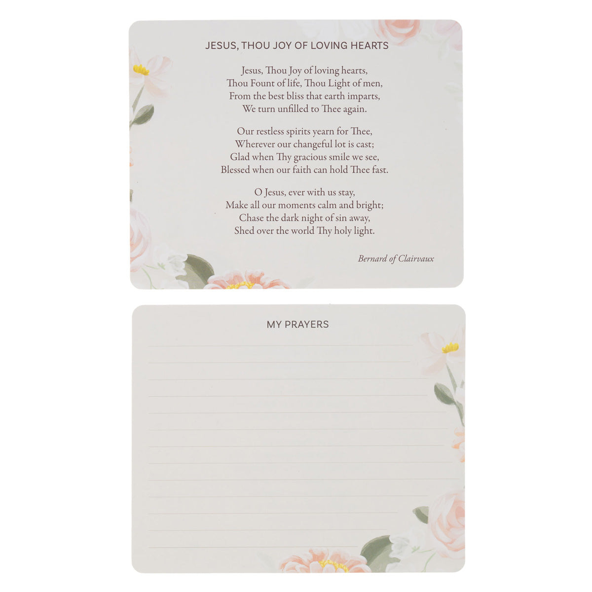 The box includes 50 double-sided prayer cards. The cards have a soft green background and beautiful full-color florals that adorn opposing corners. The front of each card features a prayer from Scripture, classic prayer books, or devout Christians. A lined space on the other side of each card allows you to write down a prayer request or document an answered prayer. With a wide variety of prayers and prompts, these cards will help motivate you to make prayer a consistent part of your routine.