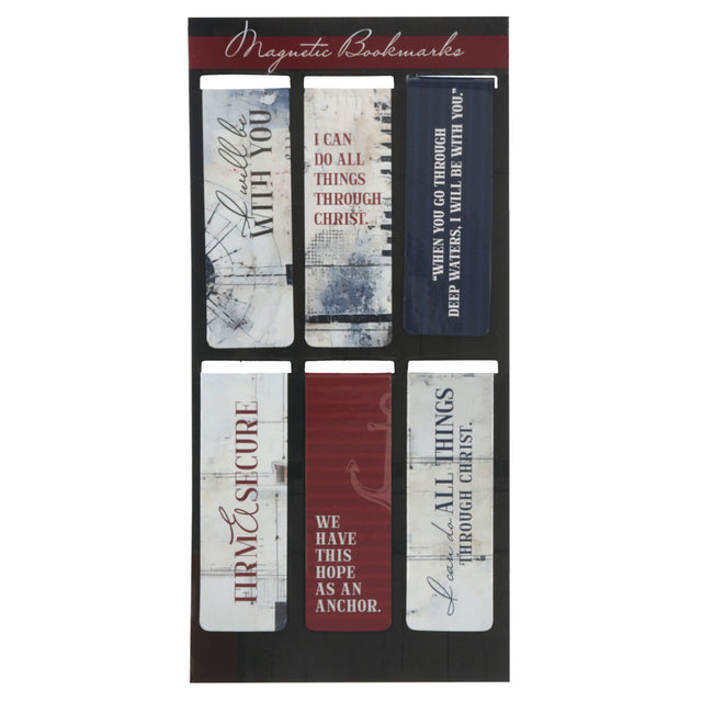 Each bookmark in the Hope as an Anchor Six-Piece Magnetic Bookmark Set highlights an inspirational Scripture verse on the front and a Scripture verse reference on the back.