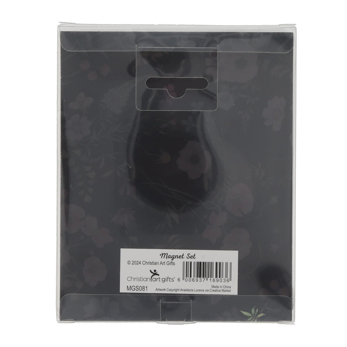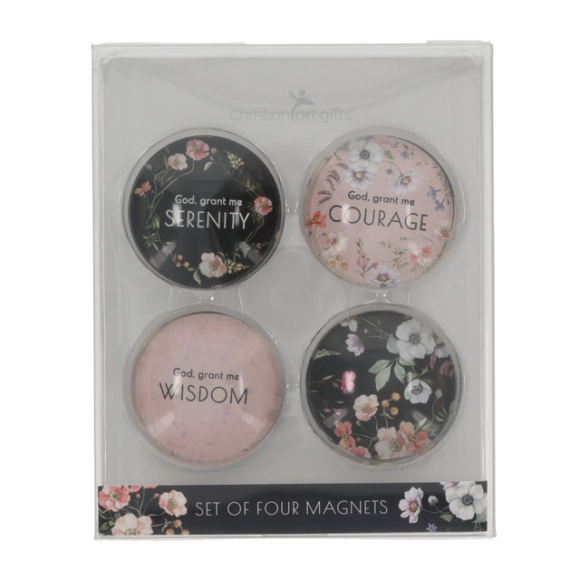 With a selection of 4 designs, inspirational sayings, and Scripture to choose from, your metal surfaces will bloom with beauty with the Serenity Prayer Four-Piece Glass Magnetic Set.