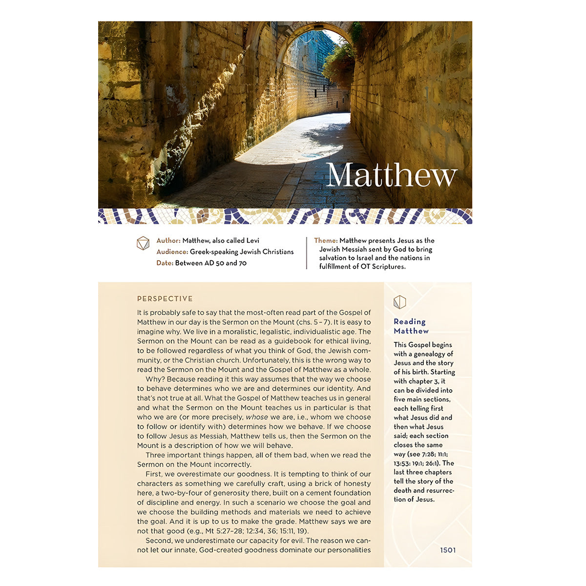 • Book Introductions provide perspective and application for every book of the Bible, plus timelines, reading guides, and more.