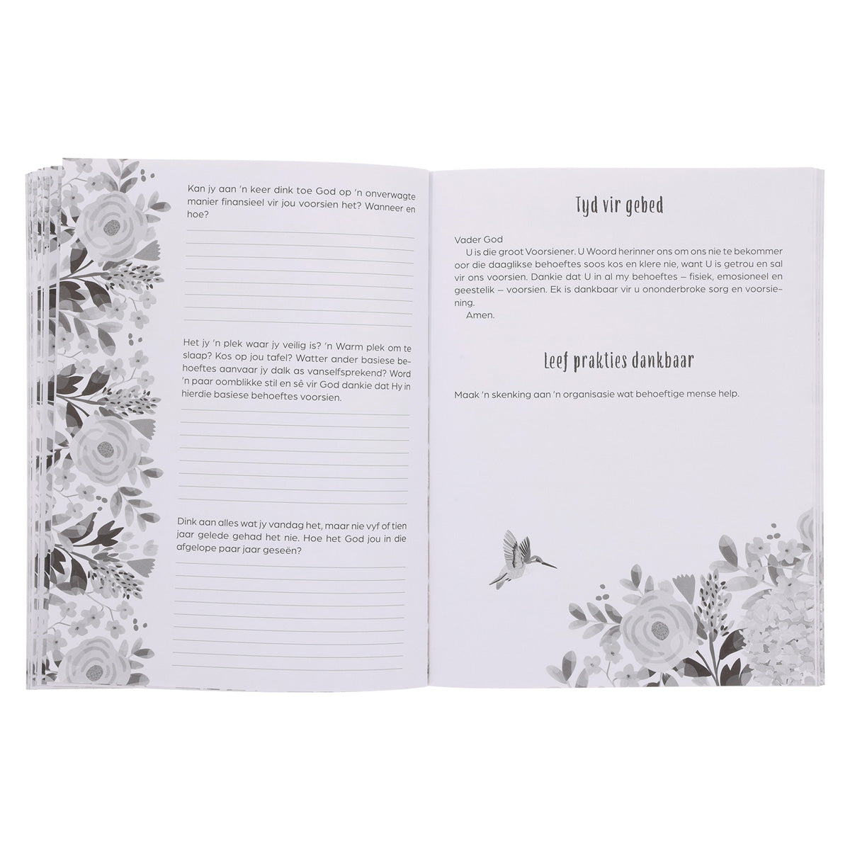 • Dankie-sê-joernaal met teksverse en inspirerende aanhalings, en genoeg plek om jou eie gebede en gedagtes neer te skryf.