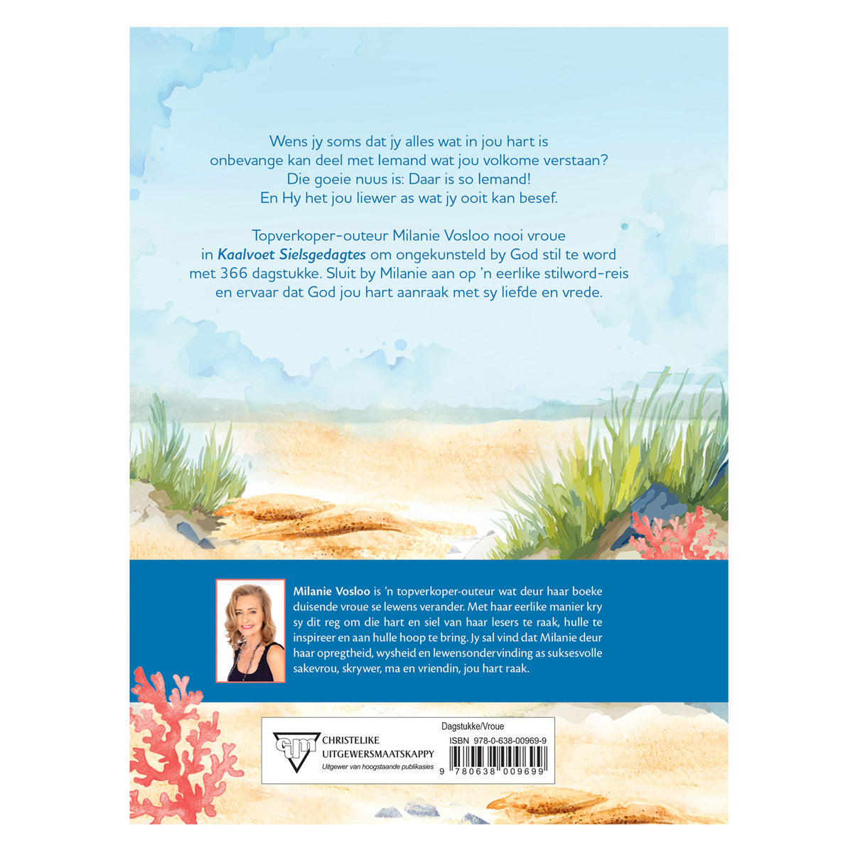 Topverkoper-outeur Milanie Vosloo nooi vroue met Kaalvoet Sielsgedagtes om ongekunsteld by God stil te word. Die 366 dagstukke moedig elke vrou aan om sonder voorgee na God toe te kom – net soos sy is. God wil hê ons moet eerlik met Hom wees oor ons behoeftes, ons vreugdes en ons vrese sodat Hy ons met sy teenwoordigheid en genade kan troos op die manier wat ons nodig het.