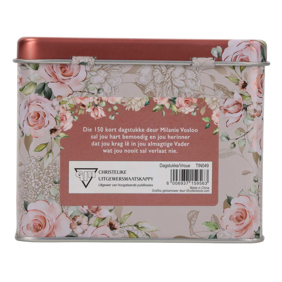 Die 75 tweekleur-kaartjies het ’n teksvers, dagstuk en gebed op beide kante en sluit temas in soos vergifnis, moederskap, twyfel, vreugdes en vrese. Die pragtige blikkie maak dit die ideale geskenk vir enige vrou wat God se nabyheid en liefde in haar lewe wil ervaar.